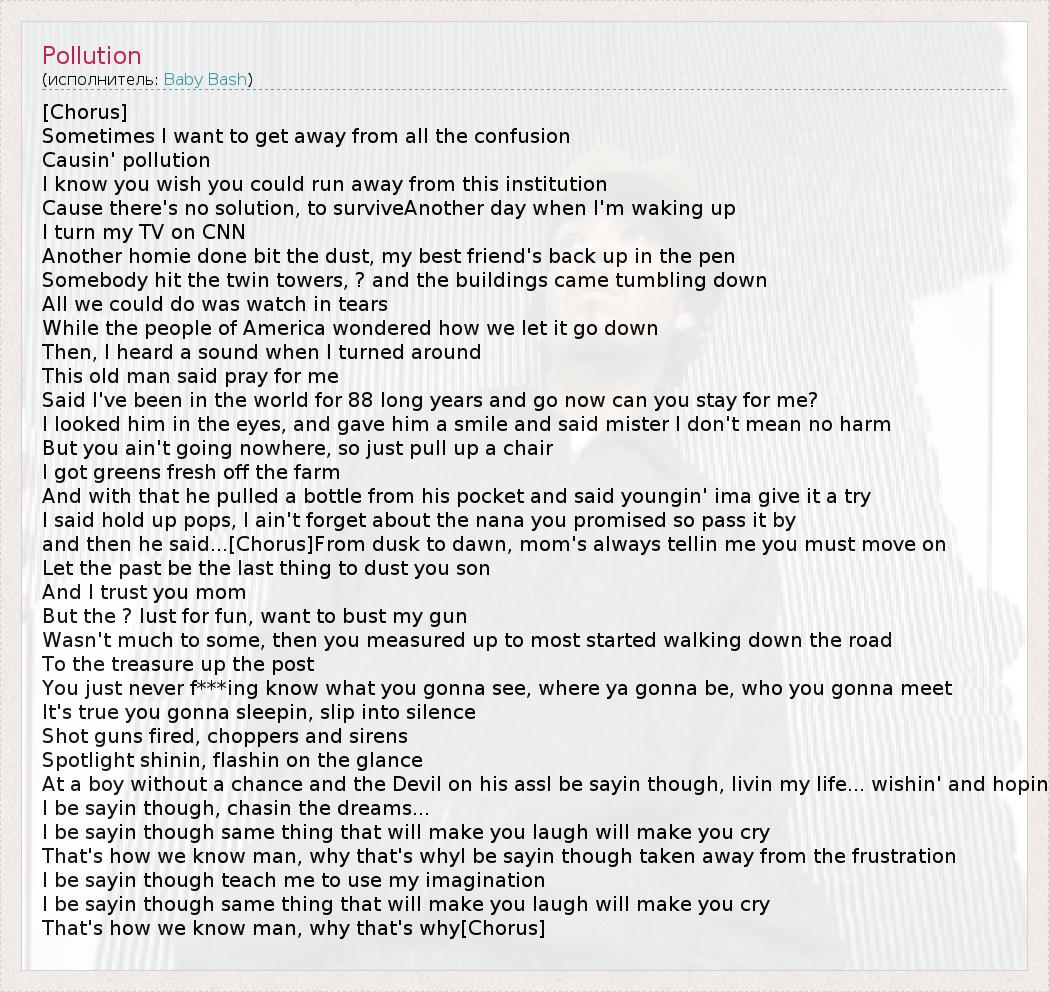 Это интересно:Baby Bash, так же известный как Baby Beesh (настоящее имя Ronnie Ray Bryant), родился 18 октября 1975 года в Калифорнии. Американский реп-исполнитель. Родители Baby Bash увлеклись героином, поэтому его воспитанием занимались его дядя и бабушка. У Baby Bash были способности к баскетболу, он даже играл в колледжской команде в середине девяностых годов. Но из-за частых травм и нежелания показываться врачу, карьера баскетболиста... продолжение