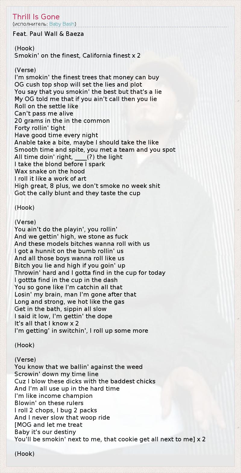 Это интересно:Baby Bash, так же известный как Baby Beesh (настоящее имя Ronnie Ray Bryant), родился 18 октября 1975 года в Калифорнии. Американский реп-исполнитель. Родители Baby Bash увлеклись героином, поэтому его воспитанием занимались его дядя и бабушка. У Baby Bash были способности к баскетболу, он даже играл в колледжской команде в середине девяностых годов. Но из-за частых травм и нежелания показываться врачу, карьера баскетболиста... продолжение