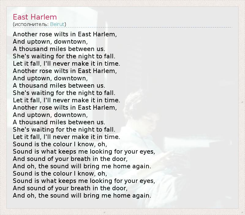 А как ты думаешь, о чем песня "East Harlem" ?