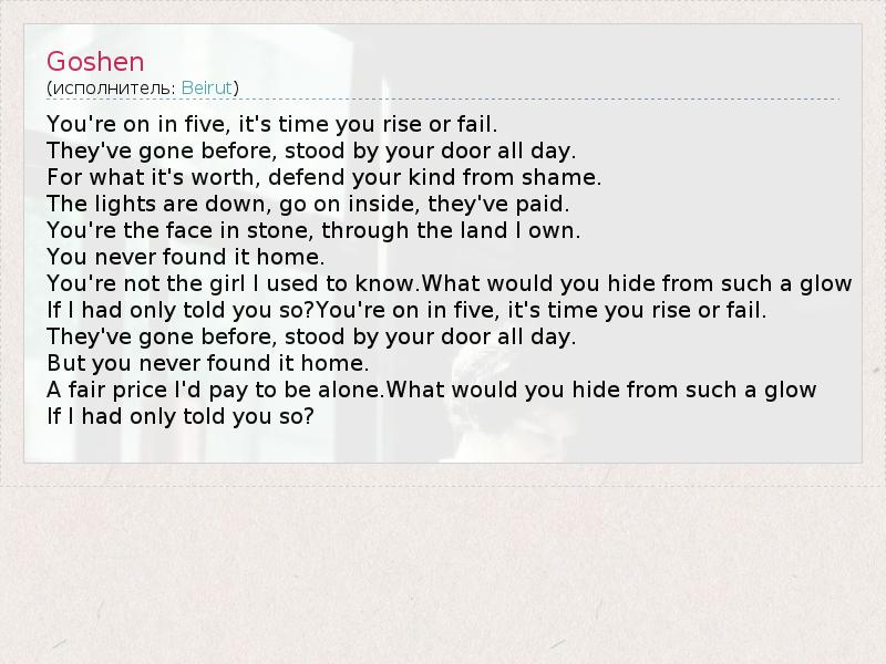 If I had only told you so?You're on in five, it's time you rise or fail.