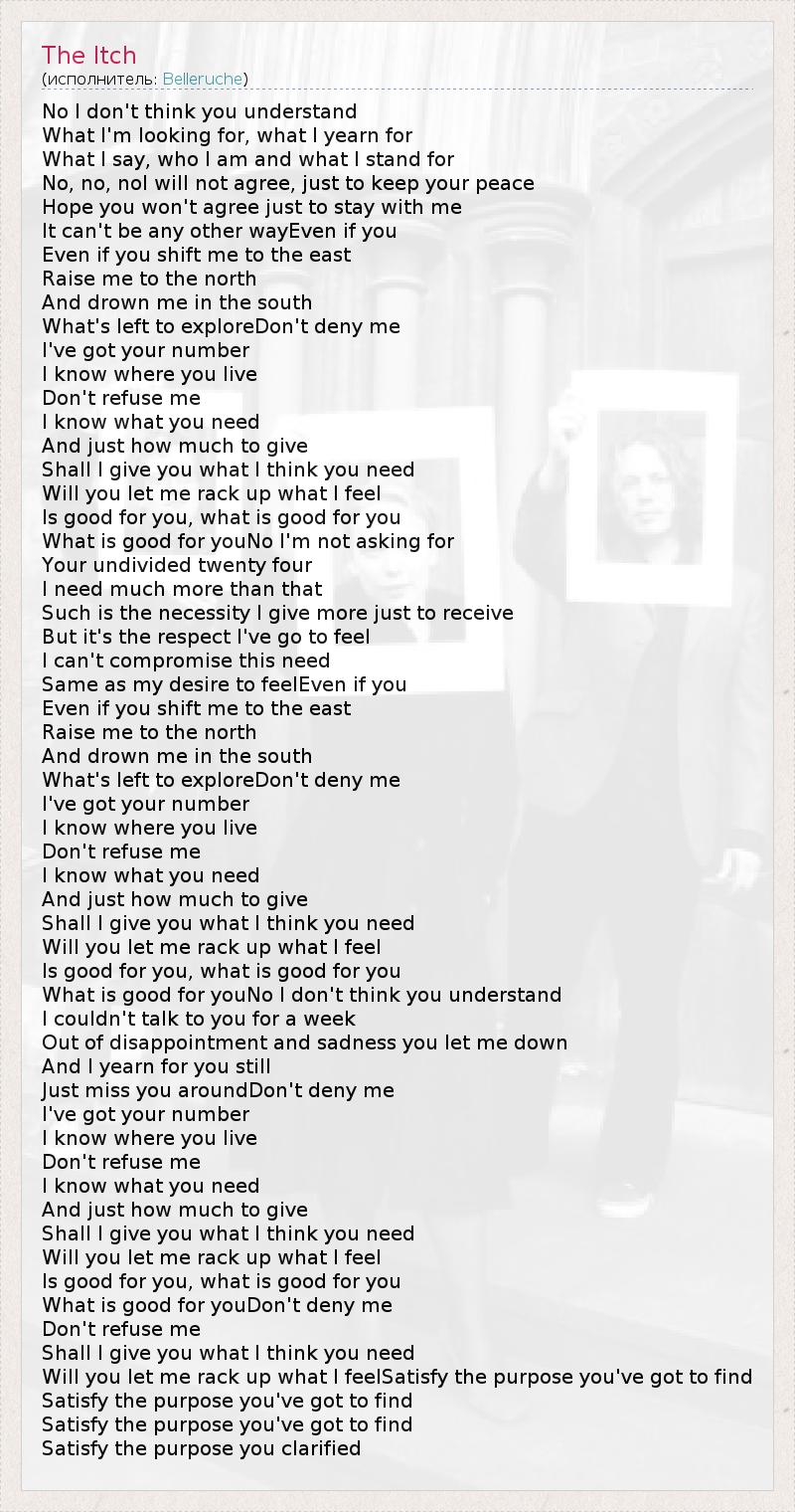 No I don't think you understand What I'm looking for, what I yearn for What I say, who I am and what I stand for No, no, noI will not agree, just to keep your peace Hope you won't agree just to stay with me It can't be any other wayEven if you Even if you shift me to the east Raise me to the north And drown me in the south What's left to exploreDon't deny me I've got your number I know where you live Don't refuse me I know what you need And just how much to give Shall I give you what I think you need Will you let me rack up what I feel Is good for you, what is good for you What is good for youNo I'm not asking for Your undivided twenty four I need much more than that Such is the necessity I give more just to receive But it's the respect I've go to feel I can't compromise this need Same as my desire to feelEven if you Even if you shift me to the east Raise me to the north And drown me in the south What's left to exploreDon't deny me I've got your number I know where you live Don't refuse me I know what you need And just how much to give Shall I give you what I think you need Will you let me rack up what I feel Is good for you, what is good for you What is good for youNo I don't think you understand I couldn't talk to you for a week Out of disappointment and sadness you let me down And I yearn for you still Just miss you aroundDon't deny me I've got your number I know where you live Don't refuse me I know what you need And just how much to give Shall I give you what I think you need Will you let me rack up what I feel Is good for you, what is good for you What is good for youDon't deny me Don't refuse me Shall I give you what I think you need Will you let me rack up what I feelSatisfy the purpose you've got to find Satisfy the purpose you've got to find Satisfy the purpose you've got to find Satisfy the purpose you clarified