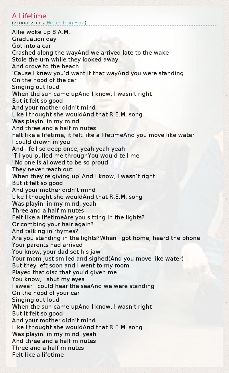 Allie woke up 8 A.M. Graduation day Got into a car Crashed along the wayAnd we arrived late to the wake Stole the urn while they looked away And drove to the beach 'Cause I knew you'd want it that wayAnd you were standing On the hood of the car Singing out loud When the sun came upAnd I know, I wasn't right But it felt so good And your mother didn't mind Like I thought she wouldAnd that R.E.M. song Was playin' in my mind And three and a half minutes Felt like a lifetime, it felt like a lifetimeAnd you move like water I could drown in you And I fell so deep once, yeah yeah yeah 'Til you pulled me throughYou would tell me "No one is allowed to be so proud They never reach out When they're giving up"And I know, I wasn't right But it felt so good And your mother didn't mind Like I thought she wouldAnd that R.E.M. song Was playin' in my mind, yeah Three and a half minutes Felt like a lifetimeAre you sitting in the lights? Or combing your hair again? And talking in rhymes? Are you standing in the lights?When I got home, heard the phone Your parents had arrived You know, your dad set his jaw Your mom just smiled and sighed(And you move like water) But they left soon and I went to my room Played that disc that you'd given me You know, I shut my eyes I swear I could hear the seaAnd we were standing On the hood of your car Singing out loud When the sun came upAnd I know, I wasn't right But it felt so good And your mother didn't mind Like I thought she wouldAnd that R.E.M. song Was playin' in my mind, yeah And three and a half minutes Three and a half minutes Felt like a lifetime