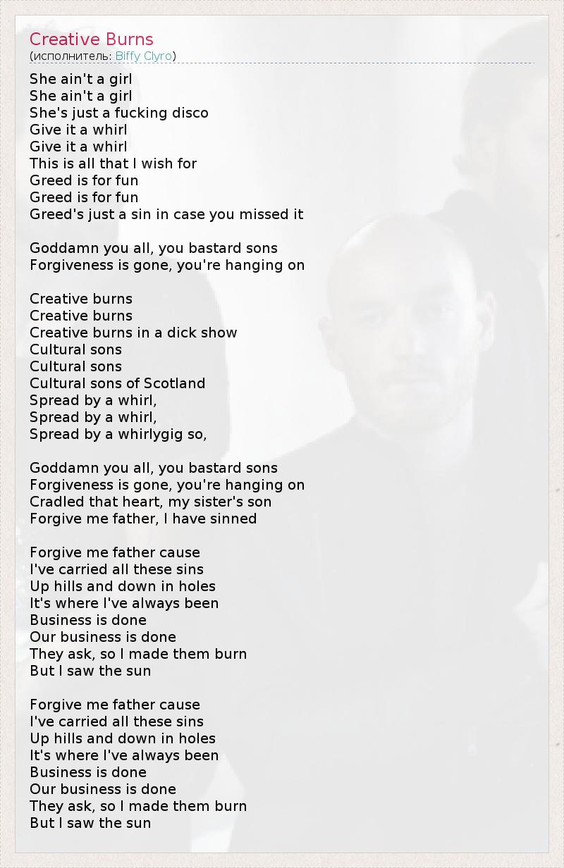 She ain't a girl She ain't a girl She's just a fucking disco Give it a whirl Give it a whirl This is all that I wish for Greed is for fun Greed is for fun Greed's just a sin in case you missed it Goddamn you all, you bastard sons Forgiveness is gone, you're hanging on Creative burns Creative burns Creative burns in a dick show Cultural sons Cultural sons Cultural sons of Scotland Spread by a whirl, Spread by a whirl, Spread by a whirlygig so, Goddamn you all, you bastard sons Forgiveness is gone, you're hanging on Cradled that heart, my sister's son Forgive me father, I have sinned Forgive me father cause I've carried all these sins Up hills and down in holes It's where I've always been Business is done Our business is done They ask, so I made them burn But I saw the sun Forgive me father cause I've carried all these sins Up hills and down in holes It's where I've always been Business is done Our business is done They ask, so I made them burn But I saw the sun