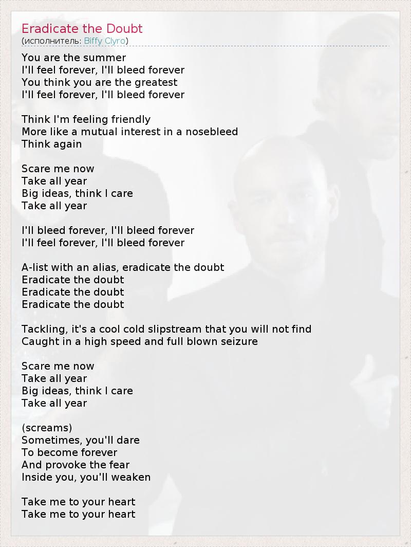 You are the summer I'll feel forever, I'll bleed forever You think you are the greatest I'll feel forever, I'll bleed forever Think I'm feeling friendly More like a mutual interest in a nosebleed Think again Scare me now Take all year Big ideas, think I care Take all year I'll bleed forever, I'll bleed forever I'll feel forever, I'll bleed forever A-list with an alias, eradicate the doubt Eradicate the doubt Eradicate the doubt Eradicate the doubt Tackling, it's a cool cold slipstream that you will not find Caught in a high speed and full blown seizure Scare me now Take all year Big ideas, think I care Take all year (screams) Sometimes, you'll dare To become forever And provoke the fear Inside you, you'll weaken Take me to your heart Take me to your heart