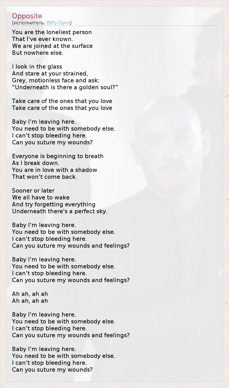 You are the loneliest person That I've ever known. We are joined at the surface But nowhere else. I look in the glass And stare at your strained, Grey, motionless face and ask: "Underneath is there a golden soul?" Take care of the ones that you love Take care of the ones that you love Baby I'm leaving here. You need to be with somebody else. I can't stop bleeding here. Can you suture my wounds? Everyone is beginning to breath As I break down. You are in love with a shadow That won't come back. Sooner or later We all have to wake And try forgetting everything Underneath there's a perfect sky. Baby I'm leaving here. You need to be with somebody else. I can't stop bleeding here. Can you suture my wounds and feelings? Baby I'm leaving here. You need to be with somebody else. I can't stop bleeding here. Can you suture my wounds and feelings? Ah ah, ah ah Ah ah, ah ah Baby I'm leaving here. You need to be with somebody else. I can't stop bleeding here. Can you suture my wounds and feelings? Baby I'm leaving here. You need to be with somebody else. I can't stop bleeding here. Can you suture my wounds?