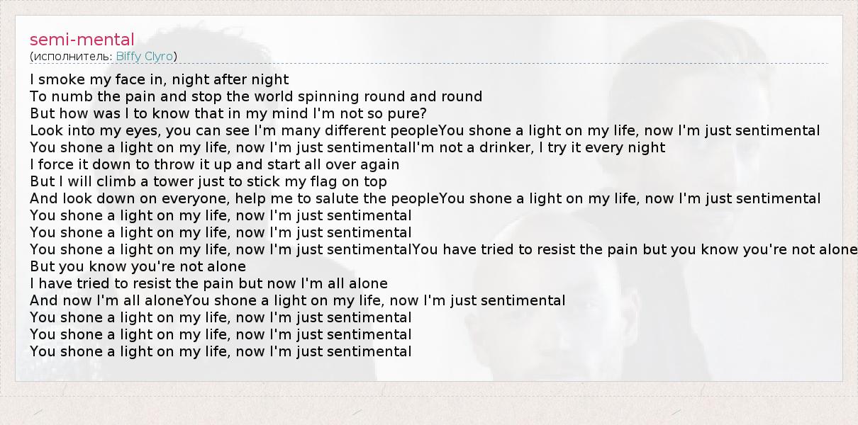 You shone a light on my life, now I'm just sentimentalYou have tried to resist the pain but you know you're not alone