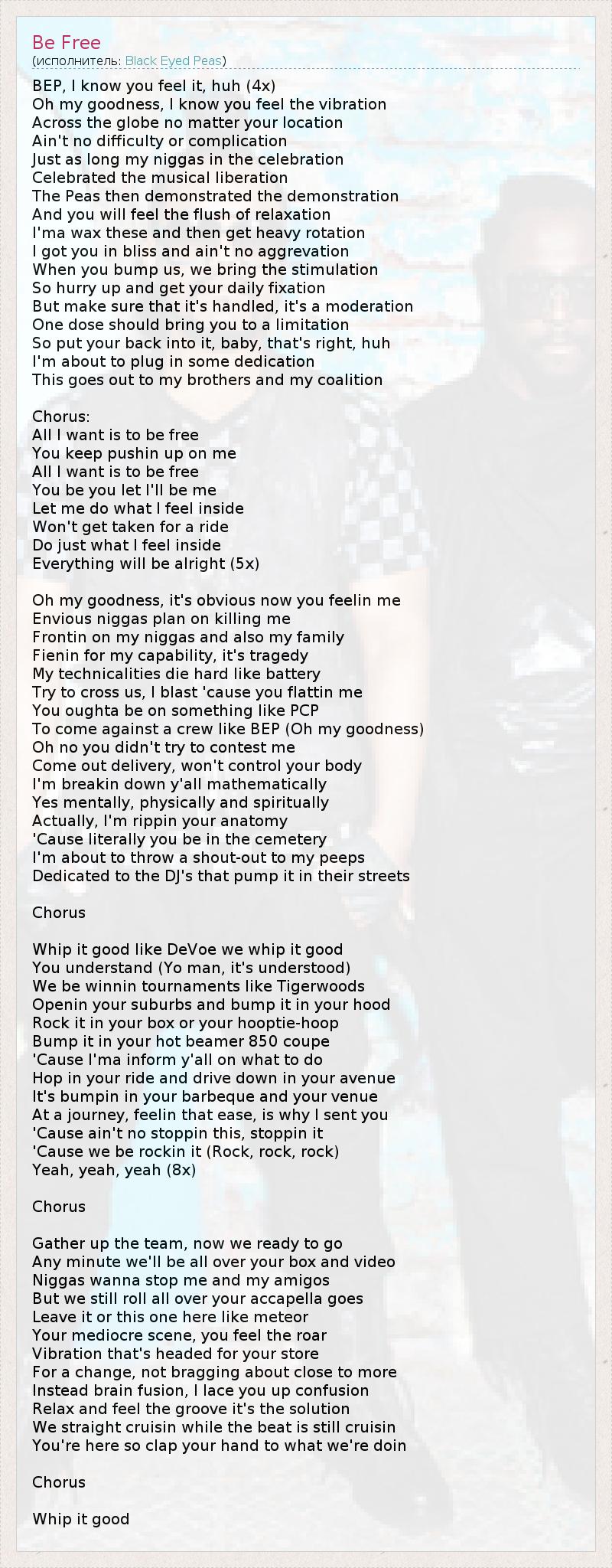 Это интересно:Блэк Ай Пис (англ. Black Eyed Peas или BEP) - американская хип-хоп/поп команда, образованная в 1995. В её составе will.i.am, Apl.de.ap, Taboo и Fergie.Коммерческий успех к группе пришел в 2003 после выпуска сингла «Where Is The Love?», записанного при участии Джастина Тимберлейка (Justin Timberlake). Обладатели... продолжение