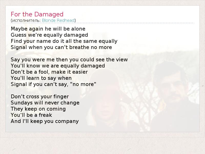 Maybe again he will be alone Guess we're equally damaged Find your name do it all the same equally Signal when you can't breathe no more Say you were me then you could see the view You'll know we are equally damaged Don't be a fool, make it easier You'll learn to say when Signal if you can't say, "no more" Don't cross your finger Sundays will never change They keep on coming You'll be a freak And I'll keep you company