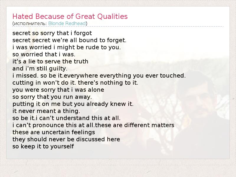 А как ты думаешь, о чем песня "Hated Because of Great Qualities" ?