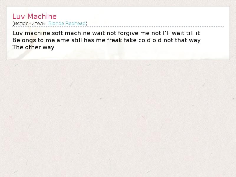 Luv machine soft machine wait not forgive me not I'll wait till it Belongs to me ame still has me freak fake cold old not that way The other way