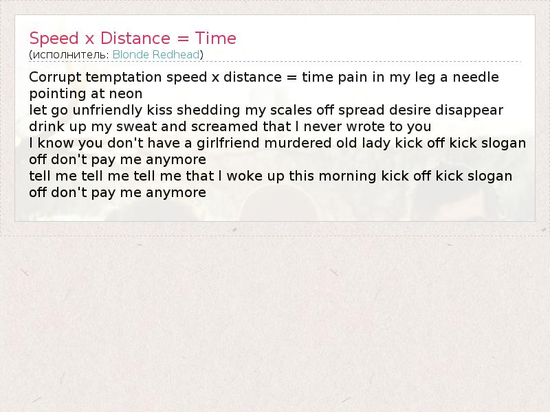 А как ты думаешь, о чем песня "Speed x Distance = Time" ?