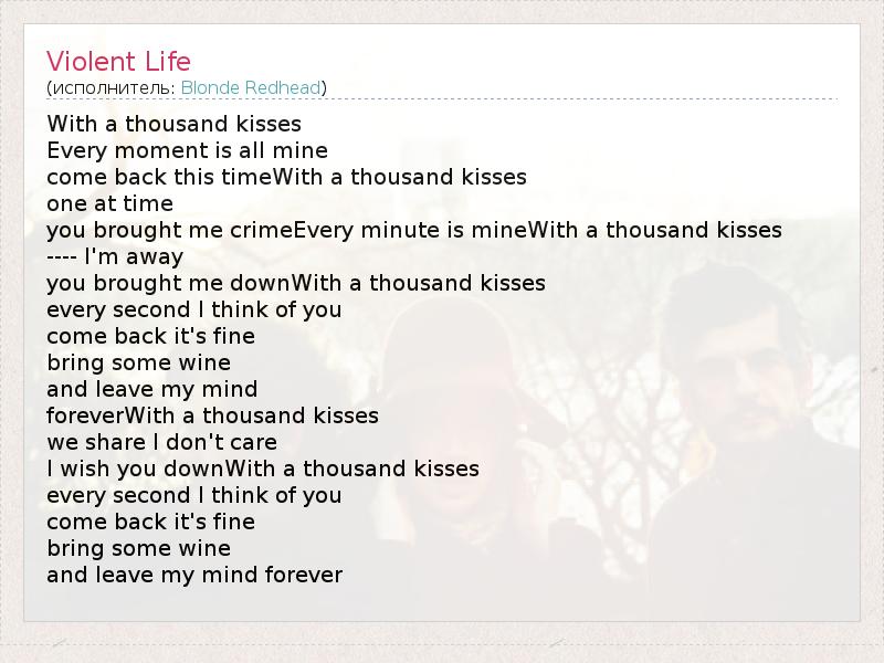 With a thousand kisses Every moment is all mine come back this timeWith a thousand kisses one at time you brought me crimeEvery minute is mineWith a thousand kisses ---- I'm away you brought me downWith a thousand kisses every second I think of you come back it's fine bring some wine and leave my mind foreverWith a thousand kisses we share I don't care I wish you downWith a thousand kisses every second I think of you come back it's fine bring some wine and leave my mind forever
