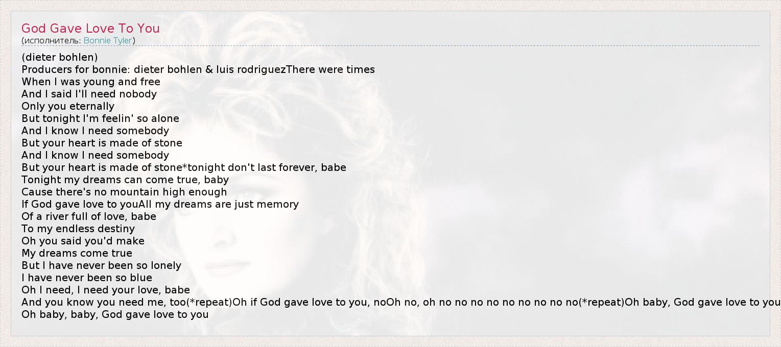 (dieter bohlen) Producers for bonnie: dieter bohlen & luis rodriguezThere were times When I was young and free And I said I'll need nobody Only you eternally But tonight I'm feelin' so alone And I know I need somebody But your heart is made of stone And I know I need somebody But your heart is made of stone*tonight don't last forever, babe Tonight my dreams can come true, baby Cause there's no mountain high enough If God gave love to youAll my dreams are just memory Of a river full of love, babe To my endless destiny Oh you said you'd make My dreams come true But I have never been so lonely I have never been so blue Oh I need, I need your love, babe And you know you need me, too(*repeat)Oh if God gave love to you, noOh no, oh no no no no no no no no no(*repeat)Oh baby, God gave love to you Oh baby, baby, God gave love to you