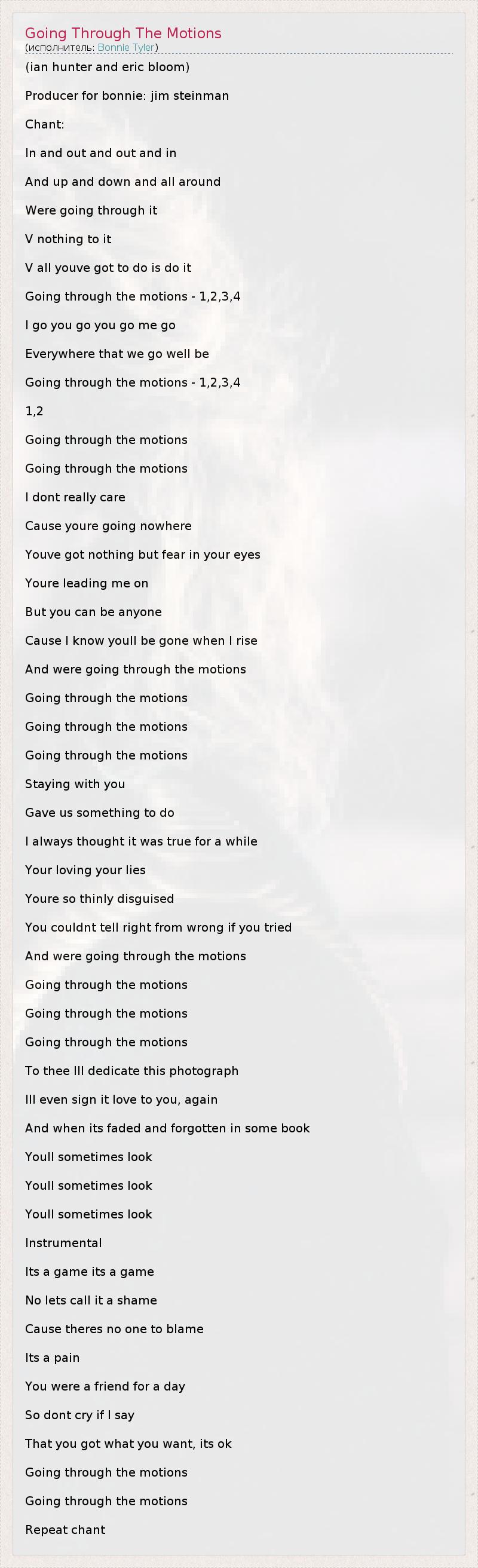 (ian hunter and eric bloom) Producer for bonnie: jim steinman Chant: In and out and out and in And up and down and all around Were going through it V nothing to it V all youve got to do is do it Going through the motions - 1,2,3,4 I go you go you go me go Everywhere that we go well be Going through the motions - 1,2,3,4 1,2 Going through the motions Going through the motions I dont really care Cause youre going nowhere Youve got nothing but fear in your eyes Youre leading me on But you can be anyone Cause I know youll be gone when I rise And were going through the motions Going through the motions Going through the motions Going through the motions Staying with you Gave us something to do I always thought it was true for a while Your loving your lies Youre so thinly disguised You couldnt tell right from wrong if you tried And were going through the motions Going through the motions Going through the motions Going through the motions To thee Ill dedicate this photograph Ill even sign it love to you, again And when its faded and forgotten in some book Youll sometimes look Youll sometimes look Youll sometimes look Instrumental Its a game its a game No lets call it a shame Cause theres no one to blame Its a pain You were a friend for a day So dont cry if I say That you got what you want, its ok Going through the motions Going through the motions Repeat chant