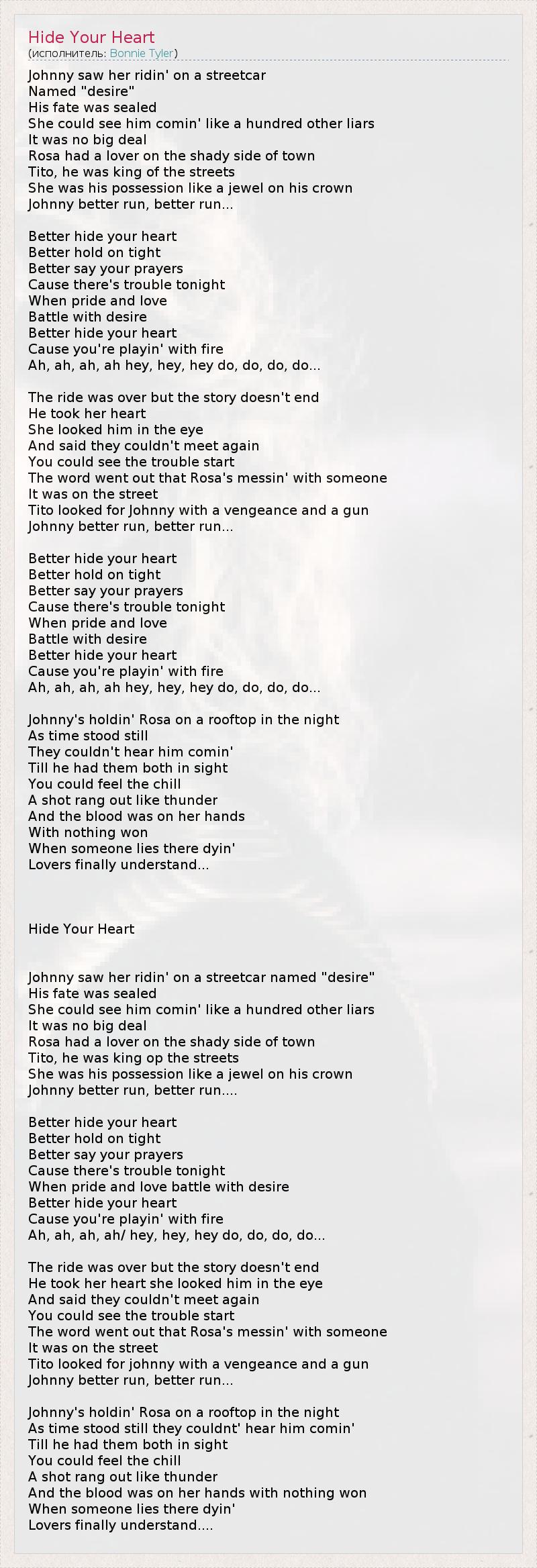 А как ты думаешь, о чем песня "Hide Your Heart" ?
