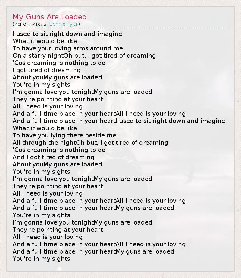 I used to sit right down and imagine What it would be like To have your loving arms around me On a starry nightOh but, I got tired of dreaming 'Cos dreaming is nothing to do I got tired of dreaming About youMy guns are loaded You're in my sights I'm gonna love you tonightMy guns are loaded They're pointing at your heart All I need is your loving And a full time place in your heartAll I need is your loving And a full time place in your heartI used to sit right down and imagine What it would be like To have you lying there beside me All through the nightOh but, I got tired of dreaming 'Cos dreaming is nothing to do And I got tired of dreaming About youMy guns are loaded You're in my sights I'm gonna love you tonightMy guns are loaded They're pointing at your heart All I need is your loving And a full time place in your heartAll I need is your loving And a full time place in your heartMy guns are loaded You're in my sights I'm gonna love you tonightMy guns are loaded They're pointing at your heart All I need is your loving And a full time place in your heartAll I need is your loving And a full time place in your heartMy guns are loaded You're in my sights