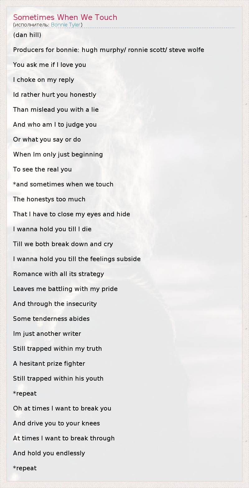 (dan hill) Producers for bonnie: hugh murphy/ ronnie scott/ steve wolfe You ask me if I love you I choke on my reply Id rather hurt you honestly Than mislead you with a lie And who am I to judge you Or what you say or do When Im only just beginning To see the real you *and sometimes when we touch The honestys too much That I have to close my eyes and hide I wanna hold you till I die Till we both break down and cry I wanna hold you till the feelings subside Romance with all its strategy Leaves me battling with my pride And through the insecurity Some tenderness abides Im just another writer Still trapped within my truth A hesitant prize fighter Still trapped within his youth *repeat Oh at times I want to break you And drive you to your knees At times I want to break through And hold you endlessly *repeat