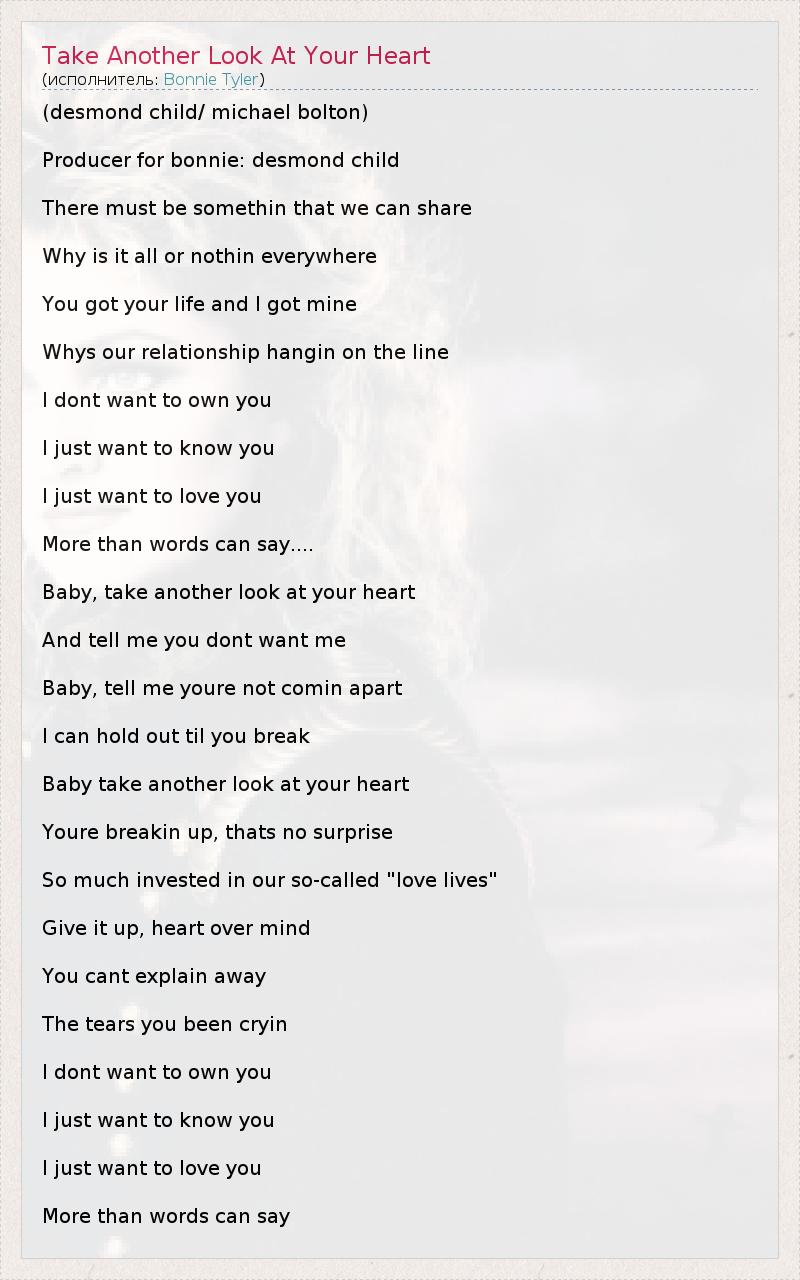 (desmond child/ michael bolton) Producer for bonnie: desmond child There must be somethin that we can share Why is it all or nothin everywhere You got your life and I got mine Whys our relationship hangin on the line I dont want to own you I just want to know you I just want to love you More than words can say.... Baby, take another look at your heart And tell me you dont want me Baby, tell me youre not comin apart I can hold out til you break Baby take another look at your heart Youre breakin up, thats no surprise So much invested in our so-called "love lives" Give it up, heart over mind You cant explain away The tears you been cryin I dont want to own you I just want to know you I just want to love you More than words can say