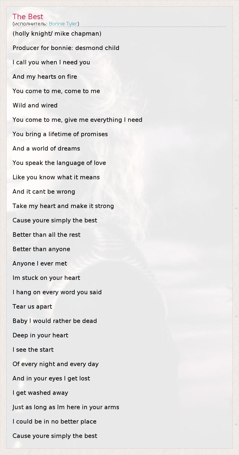 Это интересно:Бонни Тайлер (Bonnie Tyler, настоящее имя Гейнор Хопкинс, Gaynor Hopkins - родилась 8 июня 1951 в Скивен, Южный Уэльс) - английская рок-певица, троекратная номинантка премии Грэмми, а также Академии Кантри-музыки. Мировую известность Тайлер получила в 70-80-х годах благодаря международным хитам "It's A Heartache", "Holding Out For A Hero" и "Total Eclipse Of The Heart"."Total Eclipse Of The Heart" стала самой узнаваемой песней... продолжение