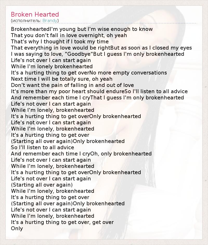 BrokenheartedI'm young but I'm wise enough to know That you don't fall in love overnight, oh yeah That's why I thought if I took my time That everything in love would be rightBut as soon as I closed my eyes I was saying to love, "Goodbye"But I guess I'm only brokenhearted Life's not over I can start again While I'm lonely brokenhearted It's a hurting thing to get overNo more empty conversations Next time I will be totally sure, oh yeah Don't want the pain of falling in and out of love It's more than my poor heart should endureSo I'll listen to all advice And remember each time I cryThat I guess I'm only brokenhearted Life's not over I can start again While I'm lonely, brokenhearted It's a hurting thing to get overOnly brokenhearted Life's not over I can start again While I'm lonely, brokenhearted It's a hurting thing to get over (Starting all over again)Only brokenhearted So I'll listen to all advice And remember each time I cryOh, only brokenhearted Life's not over I can start again While I'm lonely, brokenhearted It's a hurting thing to get overOnly brokenhearted Life's not over I can start again (Starting all over again) While I'm lonely, brokenhearted It's a hurting thing to get over (Starting all over again)Only brokenhearted Life's not over I can start again While I'm lonely, brokenhearted It's a hurting thing to get over, get over Only