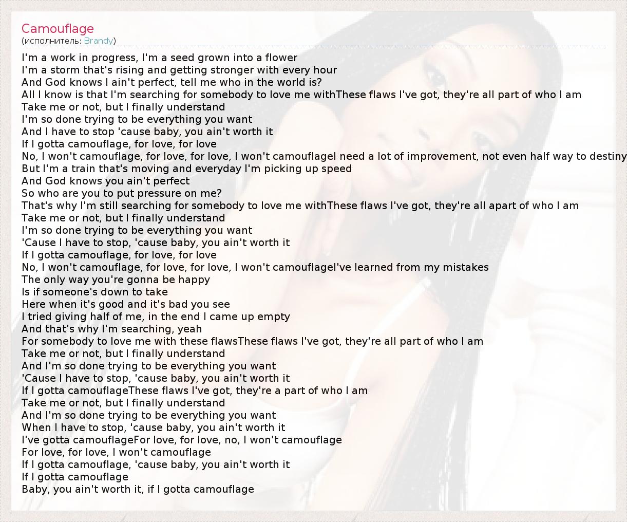 No, I won't camouflage, for love, for love, I won't camouflageI need a lot of improvement, not even half way to destiny