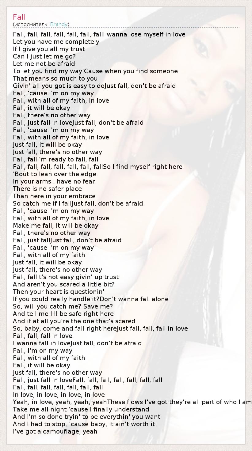 Fall, fall, fall, fall, fall, fall, fallI wanna lose myself in love Let you have me completely If I give you all my trust Can I just let me go? Let me not be afraid To let you find my way'Cause when you find someone That means so much to you Givin' all you got is easy to doJust fall, don't be afraid Fall, 'cause I'm on my way Fall, with all of my faith, in love Fall, it will be okay Fall, there's no other way Fall, just fall in loveJust fall, don't be afraid Fall, 'cause I'm on my way Fall, with all of my faith, in love Just fall, it will be okay Just fall, there's no other way Fall, fallI'm ready to fall, fall Fall, fall, fall, fall, fall, fall, fallSo I find myself right here 'Bout to lean over the edge In your arms I have no fear There is no safer place Than here in your embrace So catch me if I fallJust fall, don't be afraid Fall, 'cause I'm on my way Fall, with all of my faith, in love Make me fall, it will be okay Fall, there's no other way Fall, just fallJust fall, don't be afraid Fall, 'cause I'm on my way Fall, with all of my faith Just fall, it will be okay Just fall, there's no other way Fall, fallIt's not easy givin' up trust And aren't you scared a little bit? Then your heart is questionin' If you could really handle it?Don't wanna fall alone So, will you catch me? Save me? And tell me I'll be safe right here And if at all you're the one that's scared So, baby, come and fall right hereJust fall, fall, fall in love Fall, fall, fall in love I wanna fall in loveJust fall, don't be afraid Fall, I'm on my way Fall, with all of my faith Fall, it will be okay Just fall, there's no other way Fall, just fall in loveFall, fall, fall, fall, fall, fall, fall Fall, fall, fall, fall, fall, fall, fall In love, in love, in love, in love Yeah, in love, yeah, yeah, yeahThese flows I've got they're all part of who I am Take me all night 'cause I finally understand And I'm so done tryin' to be everythin' you want And I had to stop, 'cause baby, it ain't worth it I've got a camouflage, yeah