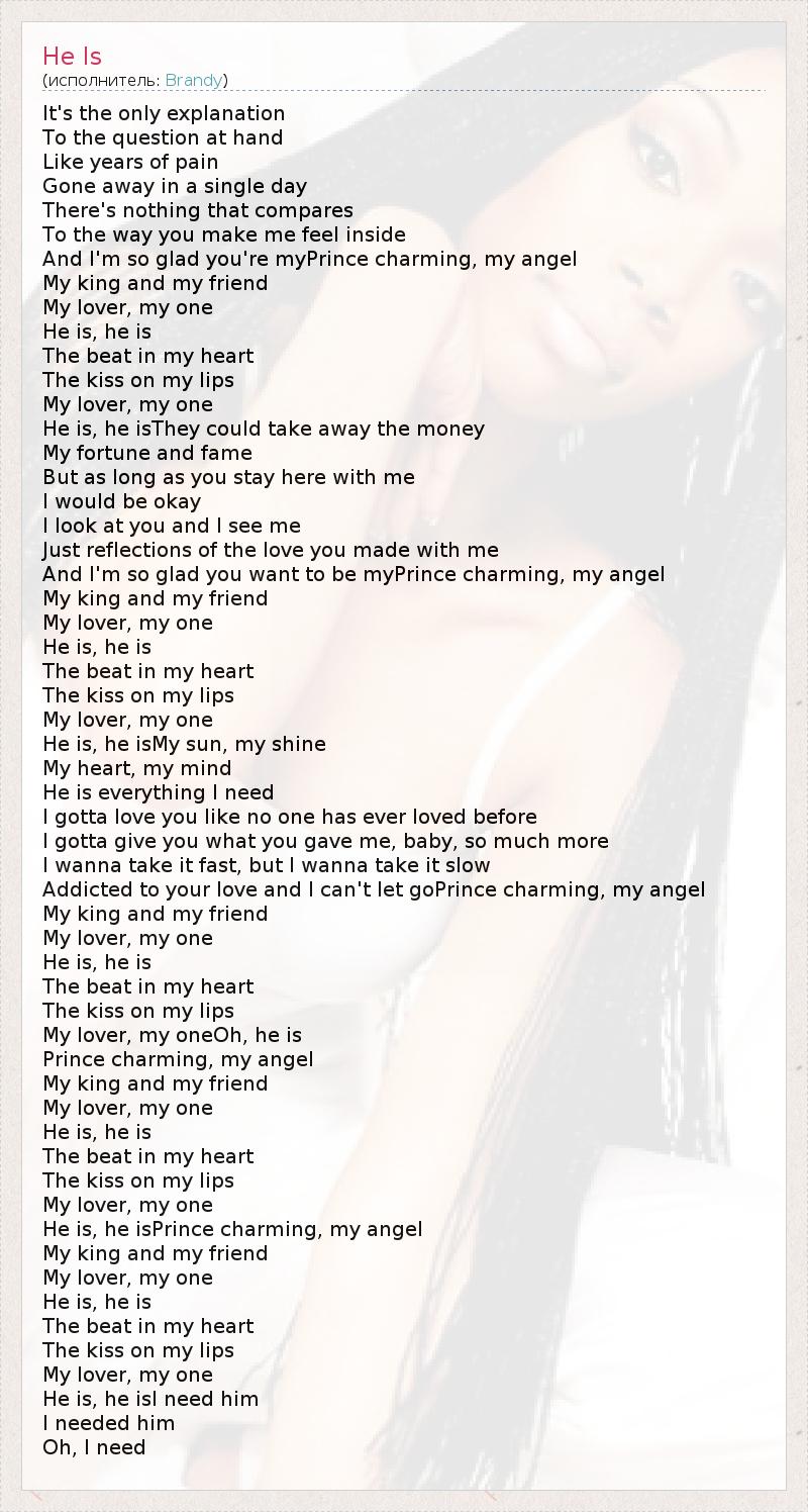 Это интересно:Брэнди - (англ. - Brandy Rayana Norwood род. 11 февраля 1979 г.) - американская певица, автор песен, продюсер и актриса. Обладательница премии "Грэмми". Согласно данным американской ассоциации звукозаписывающих компаний (RIAA) Брэнди является одной из самых успешных певиц Америки, продавшей около 9 миллионов копий альбомов на территории США и 25 миллионов по всему миру. Brandy начала петь, раньше,... продолжение