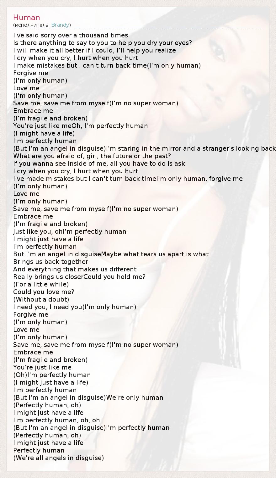 Альбом открывает решительная R&B-работа The Definition. Далее следует оптимистичный любовный гимн Warm It Up (With Love), в котором певица призывает слушателей любить своих ближних и согревать свою жизнь добротой – идея трека была явно навеяна Брэнди предвыборной кампанией Барака Обамы. Быстрый и энергичный сингл Right Here (Departed) полон эмоциональных признаний Брэнди и фактов из ее непростой биографии, и также несет в себе призыв к слушателям. Выразительная и волнующая баллада Piano Man определенно стала одной из самых сильных композиций на диске Human. Это своеобразная ода тем отношениям, которые складываются между исполнителем и продюсером – в частности, между Брэнди Норвуд и Родни Джеркинсом. Предваряемая небольшой интерлюдией, основанная на госпел-мотиве баллада Long Distance отлично продемонстрировала вокальные способности Брэнди. Еще одна поп-R&B-баллада Camouflage повествует о тех испытаниях, что артистке пришлось преодолеть в ее жизни и о тех ошибках, что она совершила. В заключении она приходит к немаловажному выводу – воспринимать Брэнди следует со всеми ее достоинствами или недостатками, она такая, какая есть. Мощная баллада Human заняла центральное место на пластинке, став настоящим манифестом певицы. В этой песне Брэнди и извиняется за совершенные ею ошибки (в том числе и аварию), и признает, что она «всего лишь человек». Другая пронзительная баллада Fall была написана певицей в сотрудничестве с коллегой по новому лейблу Наташей Бедингфилд.