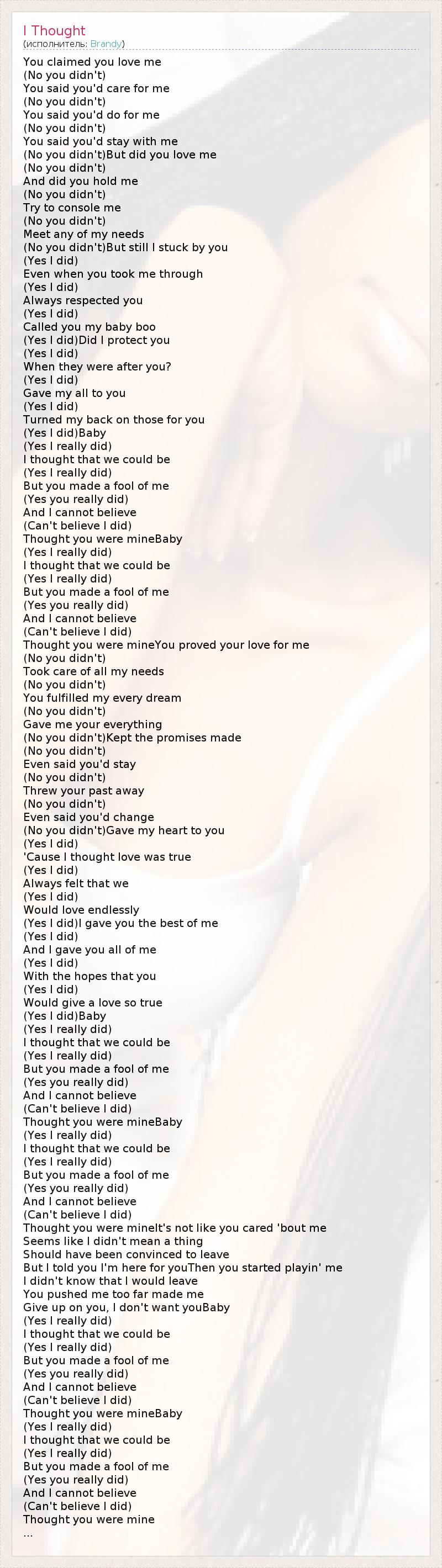 You claimed you love me (No you didn't) You said you'd care for me (No you didn't) You said you'd do for me (No you didn't) You said you'd stay with me (No you didn't)But did you love me (No you didn't) And did you hold me (No you didn't) Try to console me (No you didn't) Meet any of my needs (No you didn't)But still I stuck by you (Yes I did) Even when you took me through (Yes I did) Always respected you (Yes I did) Called you my baby boo (Yes I did)Did I protect you (Yes I did) When they were after you? (Yes I did) Gave my all to you (Yes I did) Turned my back on those for you (Yes I did)Baby (Yes I really did) I thought that we could be (Yes I really did) But you made a fool of me (Yes you really did) And I cannot believe (Can't believe I did) Thought you were mineBaby (Yes I really did) I thought that we could be (Yes I really did) But you made a fool of me (Yes you really did) And I cannot believe (Can't believe I did) Thought you were mineYou proved your love for me (No you didn't) Took care of all my needs (No you didn't) You fulfilled my every dream (No you didn't) Gave me your everything (No you didn't)Kept the promises made (No you didn't) Even said you'd stay (No you didn't) Threw your past away (No you didn't) Even said you'd change (No you didn't)Gave my heart to you (Yes I did) 'Cause I thought love was true (Yes I did) Always felt that we (Yes I did) Would love endlessly (Yes I did)I gave you the best of me (Yes I did) And I gave you all of me (Yes I did) With the hopes that you (Yes I did) Would give a love so true (Yes I did)Baby (Yes I really did) I thought that we could be (Yes I really did) But you made a fool of me (Yes you really did) And I cannot believe (Can't believe I did) Thought you were mineBaby (Yes I really did) I thought that we could be (Yes I really did) But you made a fool of me (Yes you really did) And I cannot believe (Can't believe I did) Thought you were mineIt's not like you cared 'bout me Seems like I didn't mean a thing Should have been convinced to leave But I told you I'm here for youThen you started playin' me I didn't know that I would leave You pushed me too far made me Give up on you, I don't want youBaby (Yes I really did) I thought that we could be (Yes I really did) But you made a fool of me (Yes you really did) And I cannot believe (Can't believe I did) Thought you were mineBaby (Yes I really did) I thought that we could be (Yes I really did) But you made a fool of me (Yes you really did) And I cannot believe (Can't believe I did) Thought you were mine ...
