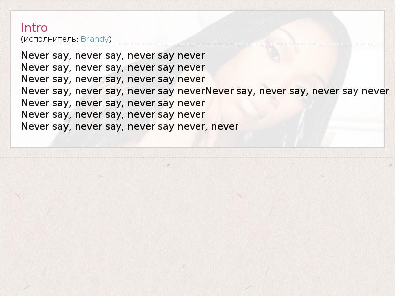 Это интересно:Брэнди - (англ. - Brandy Rayana Norwood род. 11 февраля 1979 г.) - американская певица, автор песен, продюсер и актриса. Обладательница премии "Грэмми". Согласно данным американской ассоциации звукозаписывающих компаний (RIAA) Брэнди является одной из самых успешных певиц Америки, продавшей около 9 миллионов копий альбомов на территории США и 25 миллионов по всему миру. Brandy начала петь, раньше,... продолжение