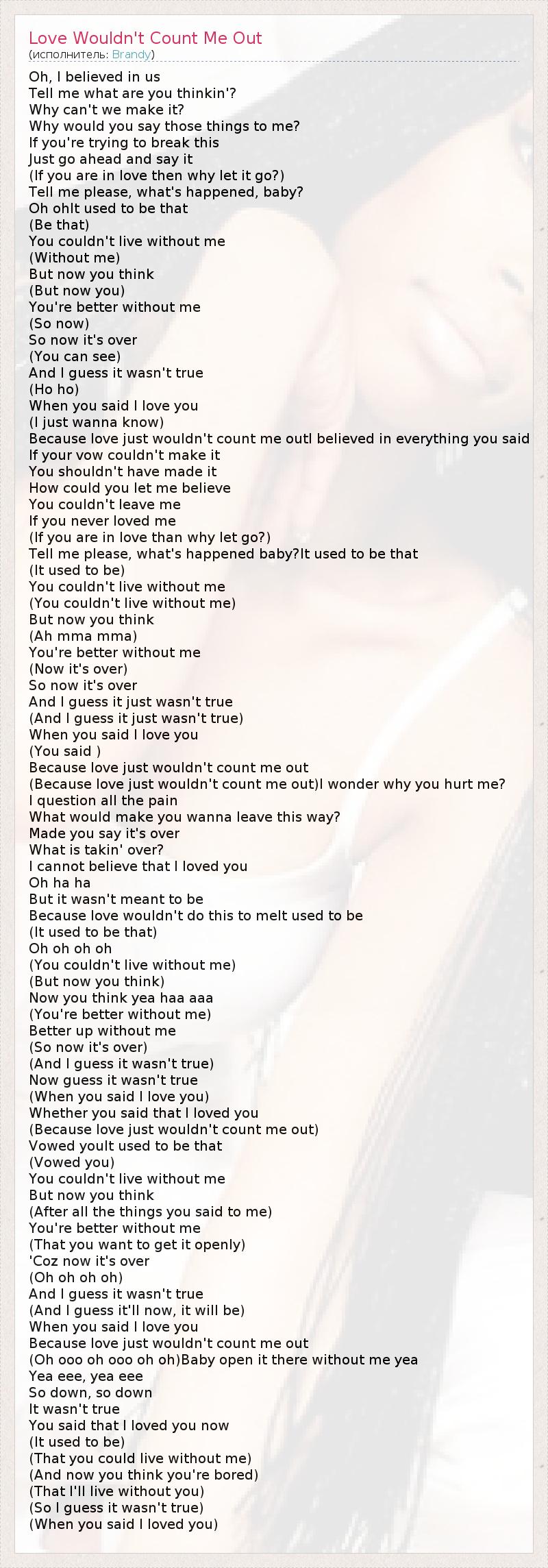 Oh, I believed in us Tell me what are you thinkin'? Why can't we make it? Why would you say those things to me? If you're trying to break this Just go ahead and say it (If you are in love then why let it go?) Tell me please, what's happened, baby? Oh ohIt used to be that (Be that) You couldn't live without me (Without me) But now you think (But now you) You're better without me (So now) So now it's over (You can see) And I guess it wasn't true (Ho ho) When you said I love you (I just wanna know) Because love just wouldn't count me outI believed in everything you said If your vow couldn't make it You shouldn't have made it How could you let me believe You couldn't leave me If you never loved me (If you are in love than why let go?) Tell me please, what's happened baby?It used to be that (It used to be) You couldn't live without me (You couldn't live without me) But now you think (Ah mma mma) You're better without me (Now it's over) So now it's over And I guess it just wasn't true (And I guess it just wasn't true) When you said I love you (You said ) Because love just wouldn't count me out (Because love just wouldn't count me out)I wonder why you hurt me? I question all the pain What would make you wanna leave this way? Made you say it's over What is takin' over? I cannot believe that I loved you Oh ha ha But it wasn't meant to be Because love wouldn't do this to meIt used to be (It used to be that) Oh oh oh oh (You couldn't live without me) (But now you think) Now you think yea haa aaa (You're better without me) Better up without me (So now it's over) (And I guess it wasn't true) Now guess it wasn't true (When you said I love you) Whether you said that I loved you (Because love just wouldn't count me out) Vowed youIt used to be that (Vowed you) You couldn't live without me But now you think (After all the things you said to me) You're better without me (That you want to get it openly) 'Coz now it's over (Oh oh oh oh) And I guess it wasn't true (And I guess it'll now, it will be) When you said I love you Because love just wouldn't count me out (Oh ooo oh ooo oh oh)Baby open it there without me yea Yea eee, yea eee So down, so down It wasn't true You said that I loved you now (It used to be) (That you could live without me) (And now you think you're bored) (That I'll live without you) (So I guess it wasn't true) (When you said I loved you)