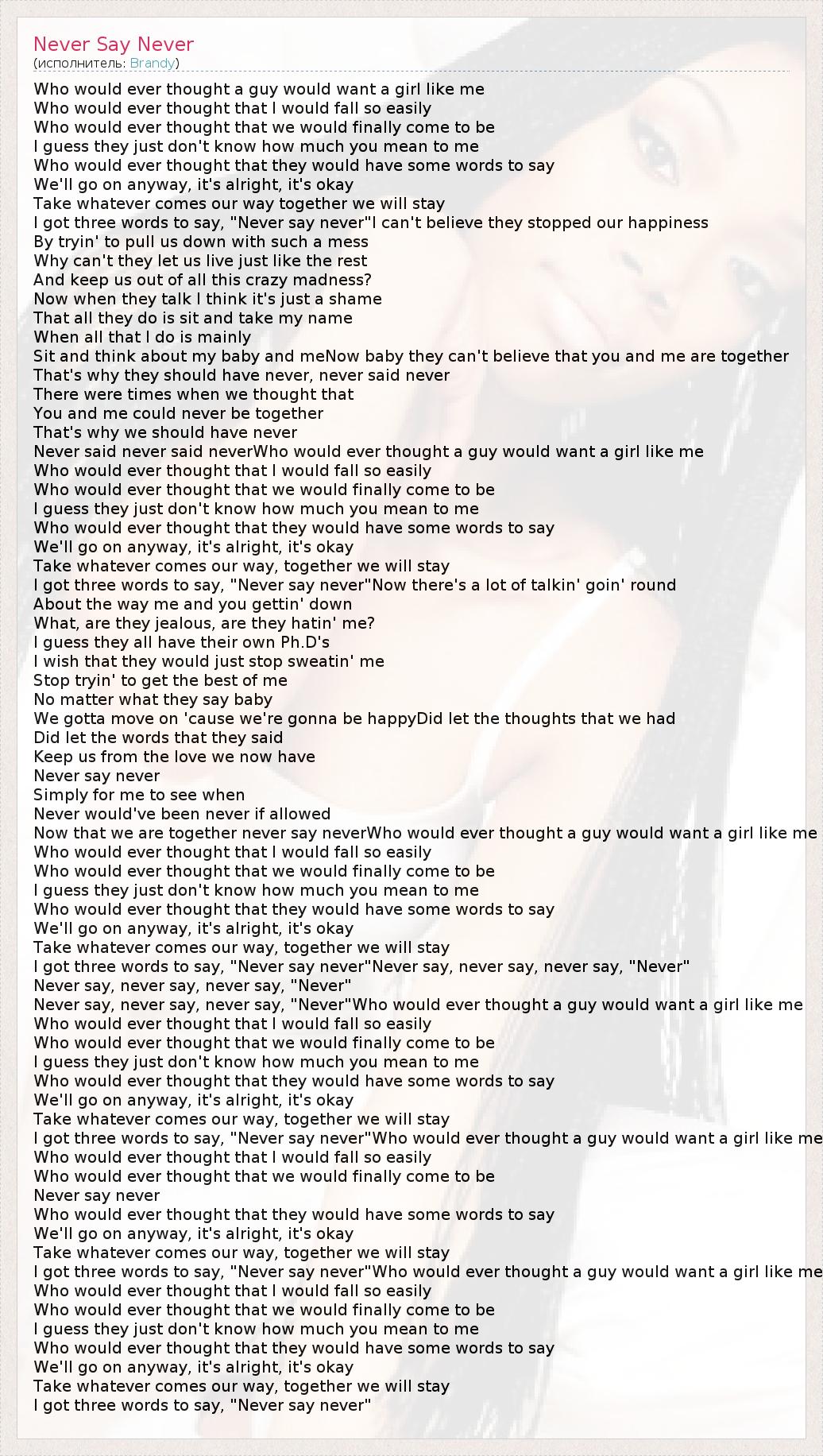 Who would ever thought a guy would want a girl like me Who would ever thought that I would fall so easily Who would ever thought that we would finally come to be I guess they just don't know how much you mean to me Who would ever thought that they would have some words to say We'll go on anyway, it's alright, it's okay Take whatever comes our way together we will stay I got three words to say, "Never say never"I can't believe they stopped our happiness By tryin' to pull us down with such a mess Why can't they let us live just like the rest And keep us out of all this crazy madness? Now when they talk I think it's just a shame That all they do is sit and take my name When all that I do is mainly Sit and think about my baby and meNow baby they can't believe that you and me are together That's why they should have never, never said never There were times when we thought that You and me could never be together That's why we should have never Never said never said neverWho would ever thought a guy would want a girl like me Who would ever thought that I would fall so easily Who would ever thought that we would finally come to be I guess they just don't know how much you mean to me Who would ever thought that they would have some words to say We'll go on anyway, it's alright, it's okay Take whatever comes our way, together we will stay I got three words to say, "Never say never"Now there's a lot of talkin' goin' round About the way me and you gettin' down What, are they jealous, are they hatin' me? I guess they all have their own Ph.D's I wish that they would just stop sweatin' me Stop tryin' to get the best of me No matter what they say baby We gotta move on 'cause we're gonna be happyDid let the thoughts that we had Did let the words that they said Keep us from the love we now have Never say never Simply for me to see when Never would've been never if allowed Now that we are together never say neverWho would ever thought a guy would want a girl like me Who would ever thought that I would fall so easily Who would ever thought that we would finally come to be I guess they just don't know how much you mean to me Who would ever thought that they would have some words to say We'll go on anyway, it's alright, it's okay Take whatever comes our way, together we will stay I got three words to say, "Never say never"Never say, never say, never say, "Never" Never say, never say, never say, "Never" Never say, never say, never say, "Never"Who would ever thought a guy would want a girl like me Who would ever thought that I would fall so easily Who would ever thought that we would finally come to be I guess they just don't know how much you mean to me Who would ever thought that they would have some words to say We'll go on anyway, it's alright, it's okay Take whatever comes our way, together we will stay I got three words to say, "Never say never"Who would ever thought a guy would want a girl like me Who would ever thought that I would fall so easily Who would ever thought that we would finally come to be Never say never Who would ever thought that they would have some words to say We'll go on anyway, it's alright, it's okay Take whatever comes our way, together we will stay I got three words to say, "Never say never"Who would ever thought a guy would want a girl like me Who would ever thought that I would fall so easily Who would ever thought that we would finally come to be I guess they just don't know how much you mean to me Who would ever thought that they would have some words to say We'll go on anyway, it's alright, it's okay Take whatever comes our way, together we will stay I got three words to say, "Never say never"