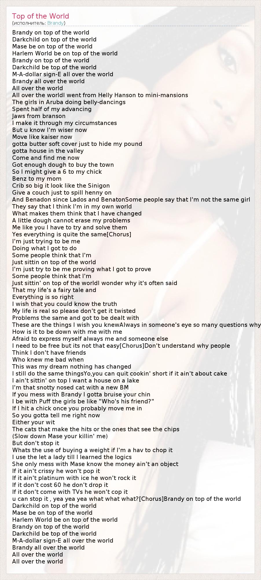 Brandy on top of the world Darkchild on top of the world Mase be on top of the world Harlem World be on top of the world Brandy on top of the world Darkchild be top of the world M-A-dollar sign-E all over the world Brandy all over the world All over the world All over the worldI went from Helly Hanson to mini-mansions The girls in Aruba doing belly-dancings Spent half of my advancing Jaws from branson I make it through my circumstances But u know I'm wiser now Move like kaiser now gotta butter soft cover just to hide my pound gotta house in the valley Come and find me now Got enough dough to buy the town So I might give a 6 to my chick Benz to my mom Crib so big it look like the Sinigon Give a couch just to spill henny on And Benadon since Lados and BenatonSome people say that I'm not the same girl They say that I think I'm in my own world What makes them think that I have changed A little dough cannot erase my problems Me like you I have to try and solve them Yes everything is quite the same[Chorus] I'm just trying to be me Doing what I got to do Some people think that I'm Just sittin on top of the world I'm just try to be me proving what I got to prove Some people think that I'm Just sittin' on top of the worldI wonder why it's often said That my life's a fairy tale and Everything is so right I wish that you could know the truth My life is real so please don't get it twisted Problems the same and got to be dealt with These are the things I wish you knewAlways in someone's eye so many questions why How is it to be down with me with me Afraid to express myself always me and someone else I need to be free but its not that easy[Chorus]Don't understand why people Think I don't have friends Who knew me bad when This was my dream nothing has changed I still do the same thingsYo,you can quit cookin' short if it ain't about cake I ain't sittin' on top I want a house on a lake I'm that snotty nosed cat with a new BM If you mess with Brandy I gotta bruise your chin I be with Puff the girls be like "Who's his friend?" If I hit a chick once you probably move me in So you gotta tell me right now Either your wit The cats that make the hits or the ones that see the chips (Slow down Mase your killin' me) But don't stop it Whats the use of buying a weight if I'm a hav to chop it I use the let a lady till I learned the logics She only mess with Mase know the money ain't an object If it ain't crissy he won't pop it If it ain't platinum with ice he won't rock it If it don't cost 60 he don't drop it If it don't come with TVs he won't cop it u can stop it , yea yea yea what what what?[Chorus]Brandy on top of the world Darkchild on top of the world Mase be on top of the world Harlem World be on top of the world Brandy on top of the world Darkchild be top of the world M-A-dollar sign-E all over the world Brandy all over the world All over the world All over the world
