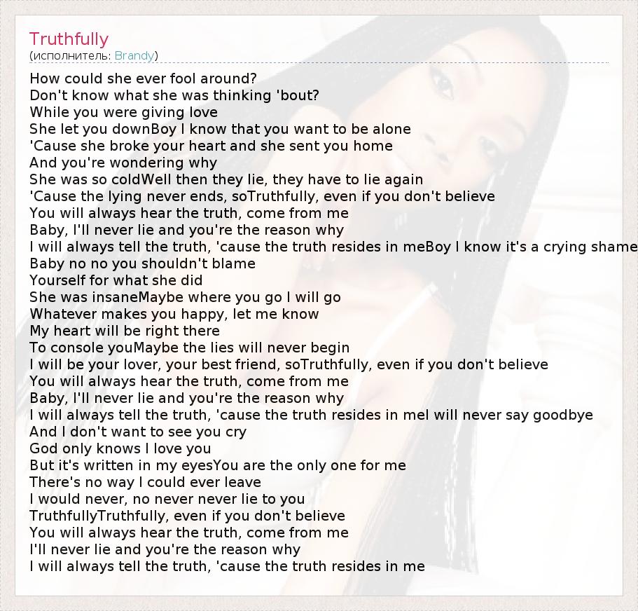 How could she ever fool around? Don't know what she was thinking 'bout? While you were giving love She let you downBoy I know that you want to be alone 'Cause she broke your heart and she sent you home And you're wondering why She was so coldWell then they lie, they have to lie again 'Cause the lying never ends, soTruthfully, even if you don't believe You will always hear the truth, come from me Baby, I'll never lie and you're the reason why I will always tell the truth, 'cause the truth resides in meBoy I know it's a crying shame Baby no no you shouldn't blame Yourself for what she did She was insaneMaybe where you go I will go Whatever makes you happy, let me know My heart will be right there To console youMaybe the lies will never begin I will be your lover, your best friend, soTruthfully, even if you don't believe You will always hear the truth, come from me Baby, I'll never lie and you're the reason why I will always tell the truth, 'cause the truth resides in meI will never say goodbye And I don't want to see you cry God only knows I love you But it's written in my eyesYou are the only one for me There's no way I could ever leave I would never, no never never lie to you TruthfullyTruthfully, even if you don't believe You will always hear the truth, come from me I'll never lie and you're the reason why I will always tell the truth, 'cause the truth resides in me
