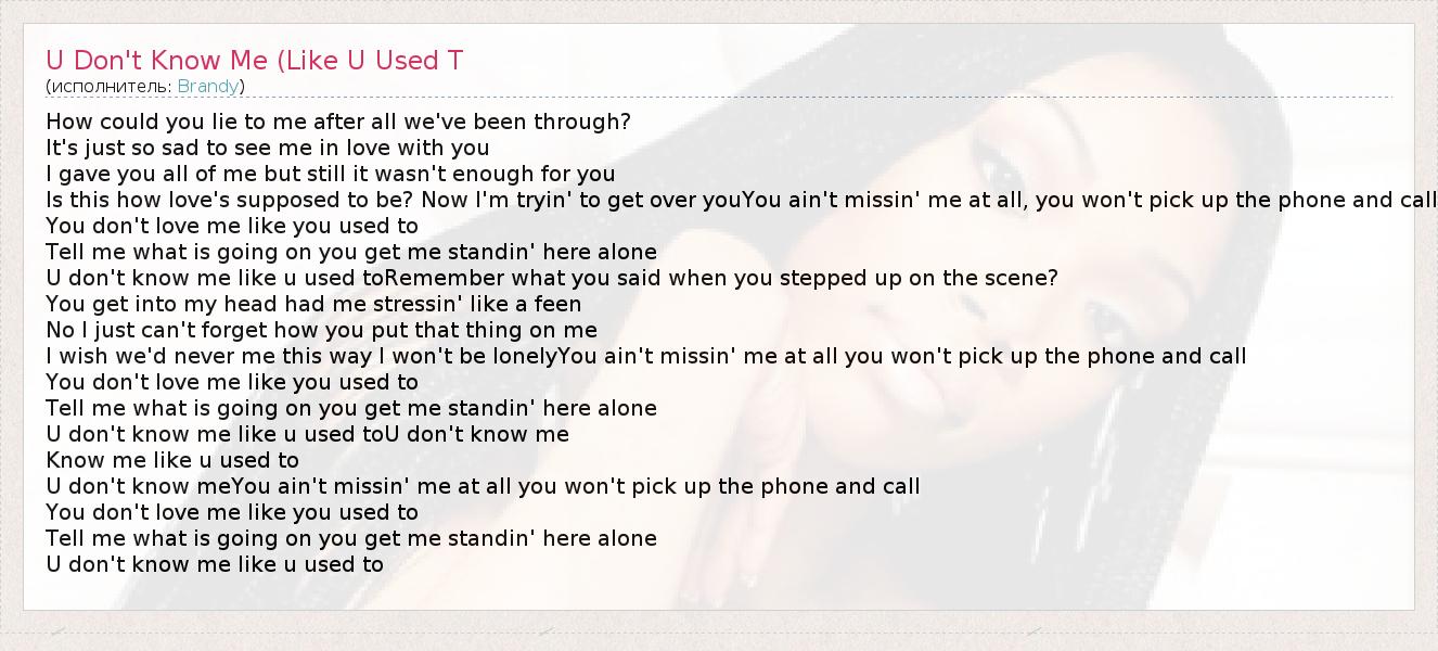 How could you lie to me after all we've been through? It's just so sad to see me in love with you I gave you all of me but still it wasn't enough for you Is this how love's supposed to be? Now I'm tryin' to get over youYou ain't missin' me at all, you won't pick up the phone and call You don't love me like you used to Tell me what is going on you get me standin' here alone U don't know me like u used toRemember what you said when you stepped up on the scene? You get into my head had me stressin' like a feen No I just can't forget how you put that thing on me I wish we'd never me this way I won't be lonelyYou ain't missin' me at all you won't pick up the phone and call You don't love me like you used to Tell me what is going on you get me standin' here alone U don't know me like u used toU don't know me Know me like u used to U don't know meYou ain't missin' me at all you won't pick up the phone and call You don't love me like you used to Tell me what is going on you get me standin' here alone U don't know me like u used to