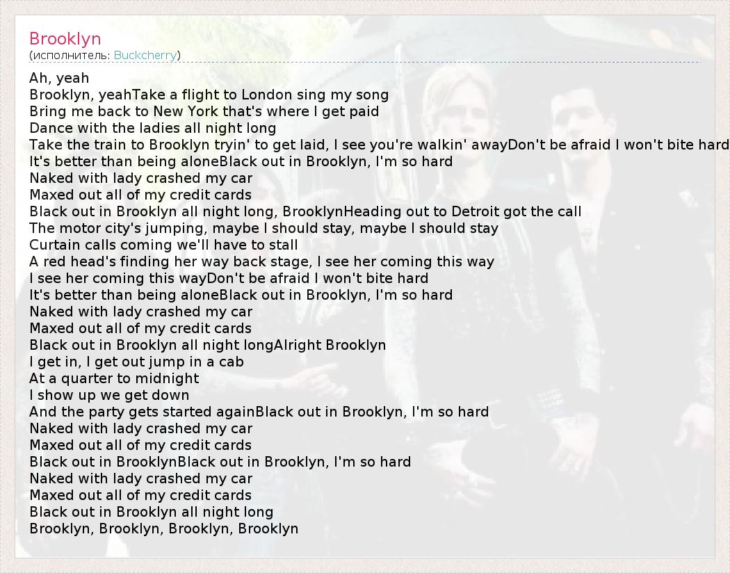 Ah, yeah Brooklyn, yeahTake a flight to London sing my song Bring me back to New York that's where I get paid Dance with the ladies all night long Take the train to Brooklyn tryin' to get laid, I see you're walkin' awayDon't be afraid I won't bite hard It's better than being aloneBlack out in Brooklyn, I'm so hard Naked with lady crashed my car Maxed out all of my credit cards Black out in Brooklyn all night long, BrooklynHeading out to Detroit got the call The motor city's jumping, maybe I should stay, maybe I should stay Curtain calls coming we'll have to stall A red head's finding her way back stage, I see her coming this way I see her coming this wayDon't be afraid I won't bite hard It's better than being aloneBlack out in Brooklyn, I'm so hard Naked with lady crashed my car Maxed out all of my credit cards Black out in Brooklyn all night longAlright Brooklyn I get in, I get out jump in a cab At a quarter to midnight I show up we get down And the party gets started againBlack out in Brooklyn, I'm so hard Naked with lady crashed my car Maxed out all of my credit cards Black out in BrooklynBlack out in Brooklyn, I'm so hard Naked with lady crashed my car Maxed out all of my credit cards Black out in Brooklyn all night long Brooklyn, Brooklyn, Brooklyn, Brooklyn