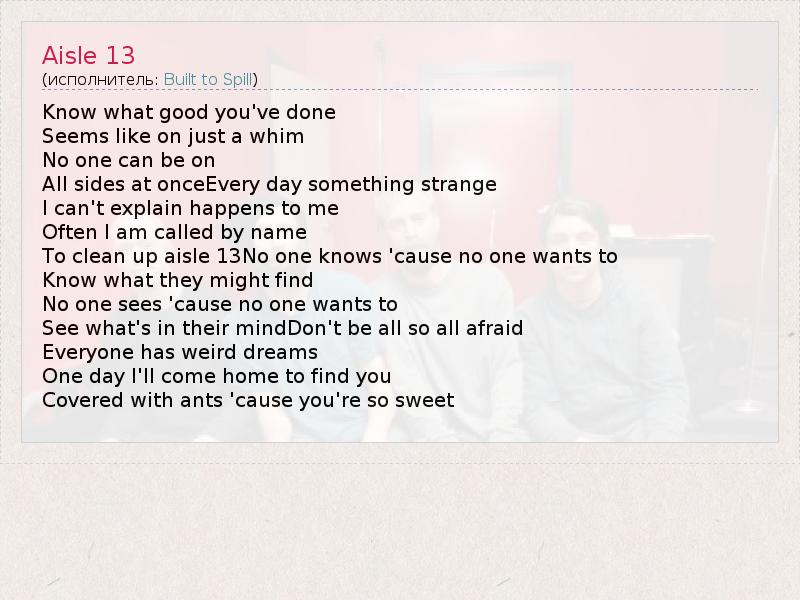 А как ты думаешь, о чем песня "Aisle 13" ?
