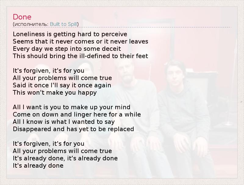 Loneliness is getting hard to perceive Seems that it never comes or it never leaves Every day we step into some deceit This should bring the ill-defined to their feet It's forgiven, it's for you All your problems will come true Said it once I'll say it once again This won't make you happy All I want is you to make up your mind Come on down and linger here for a while All I know is what I wanted to say Disappeared and has yet to be replaced It's forgiven, it's for you All your problems will come true It's already done, it's already done It's already done