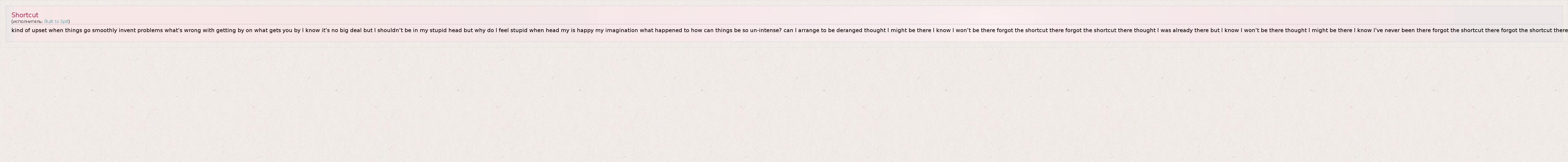 kind of upset when things go smoothly invent problems what's wrong with getting by on what gets you by I know it's no big deal but I shouldn't be in my stupid head but why do I feel stupid when head my is happy my imagination what happened to how can things be so un-intense? can I arrange to be deranged thought I might be there I know I won't be there forgot the shortcut there forgot the shortcut there thought I was already there but I know I won't be there thought I might be there I know I've never been there forgot the shortcut there forgot the shortcut there