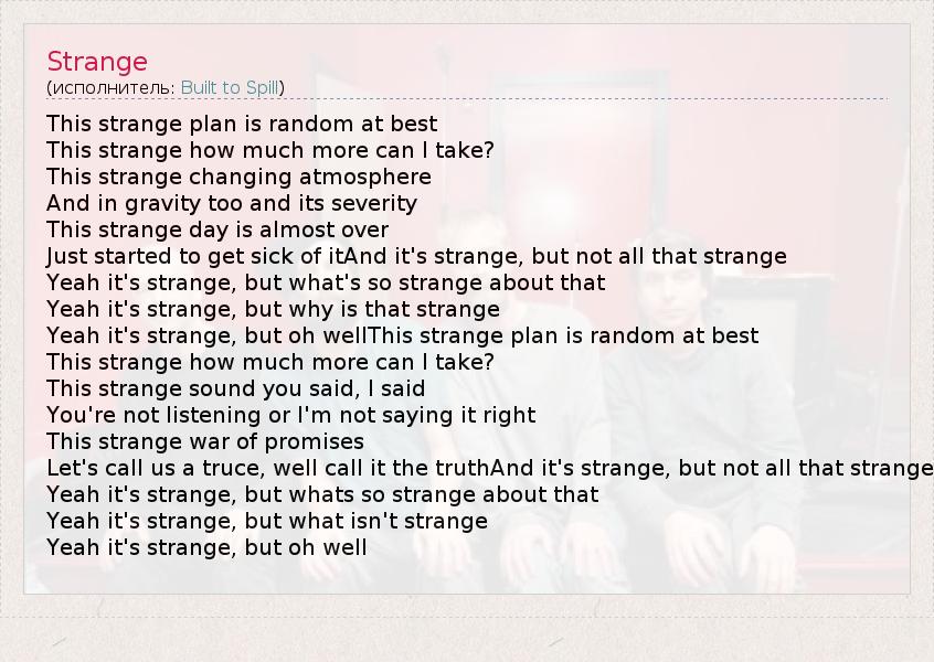This strange plan is random at best This strange how much more can I take? This strange changing atmosphere And in gravity too and its severity This strange day is almost over Just started to get sick of itAnd it's strange, but not all that strange Yeah it's strange, but what's so strange about that Yeah it's strange, but why is that strange Yeah it's strange, but oh wellThis strange plan is random at best This strange how much more can I take? This strange sound you said, I said You're not listening or I'm not saying it right This strange war of promises Let's call us a truce, well call it the truthAnd it's strange, but not all that strange Yeah it's strange, but whats so strange about that Yeah it's strange, but what isn't strange Yeah it's strange, but oh well