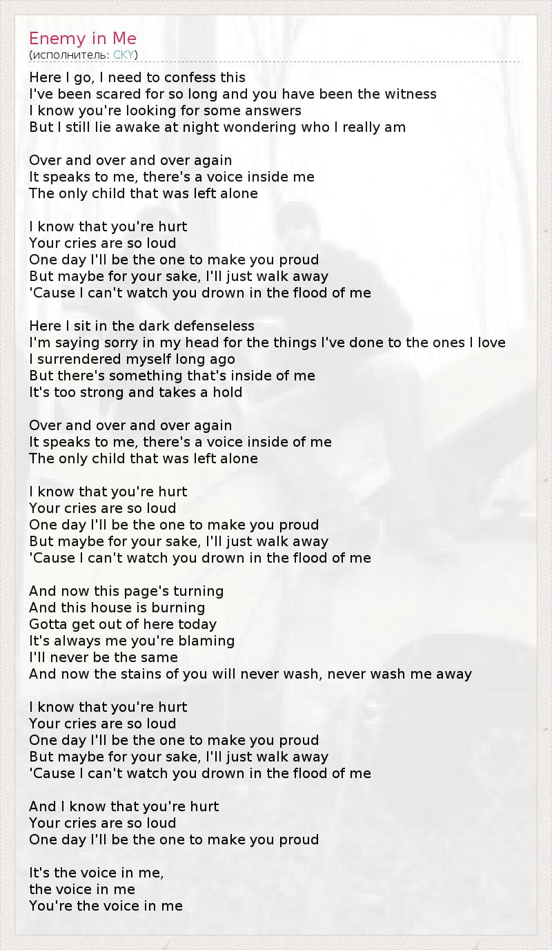 И вот мне нужно признать, Что я долгое время был напуган и ты тому свидетель. Я знаю, что ты хочешь знать ответы на свои вопросы, Но по ночам я всё ещё не смыкаю глаз, задаваясь вопросом: "Кто я?" Снова и снова Он говорит со мной, этот голос внутри меня - Голос ребёнка, покинутого всеми. Я знаю, тебе больно, Твой плач такой громкий! Однажды я стану тем, кто заставит тебя гордиться. А может быть я уйду ради тебя, Потому что я не могу смотреть на то, как ты "тонешь" во мне. И вот я беззащитный сижу во тьме, Мысленно моля о прощении за то, что я причинил тем, кого люблю. Я давно уже сдался, Но есть внутри меня что-то, Нечто очень сильное и овладевающее мной... Снова и снова Он говорит со мной, этот голос внутри меня - Голос ребёнка, покинутого всеми. Я знаю, тебе больно, Твой плач такой громкий! Однажды я стану тем, кто заставит тебя гордиться. А может быть я уйду ради тебя, Потому что я не могу смотреть на то, как ты "тонешь" во мне. Сейчас эта страница наконец-то переворачивается, А этот дом горит. Нужно убираться отсюда сегодня же... Ты всегда винишь во всём меня. Я уже никогда не смогу быть собой, Ведь пятна, оставленные тобой, мне уже никогда не смыть с себя. Я знаю, тебе больно, Твой плач такой громкий! Однажды я стану тем, кто заставит тебя гордиться. А может быть я уйду ради тебя, Потому что я не могу смотреть на то, как ты "тонешь" во мне. Я знаю, тебе больно, Твой плач такой громкий! Однажды я стану тем, кто заставит тебя гордиться. Тот голос во мне, Голос в моей голове, Это ты — тот самый голос внутри меня.