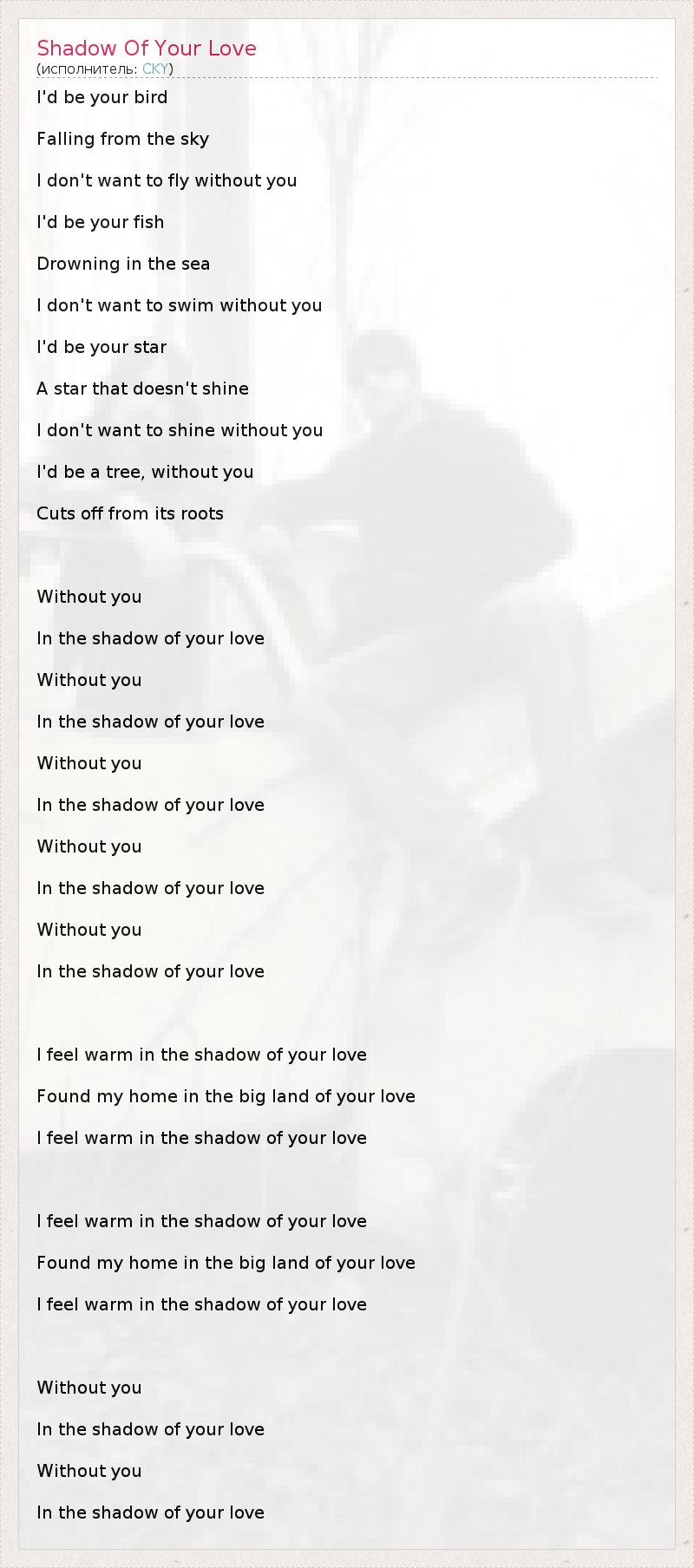 I'd be your bird Falling from the sky I don't want to fly without you I'd be your fish Drowning in the sea I don't want to swim without you I'd be your star A star that doesn't shine I don't want to shine without you I'd be a tree, without you Cuts off from its roots Without you In the shadow of your love Without you In the shadow of your love Without you In the shadow of your love Without you In the shadow of your love Without you In the shadow of your love I feel warm in the shadow of your love Found my home in the big land of your love I feel warm in the shadow of your love I feel warm in the shadow of your love Found my home in the big land of your love I feel warm in the shadow of your love Without you In the shadow of your love Without you In the shadow of your love