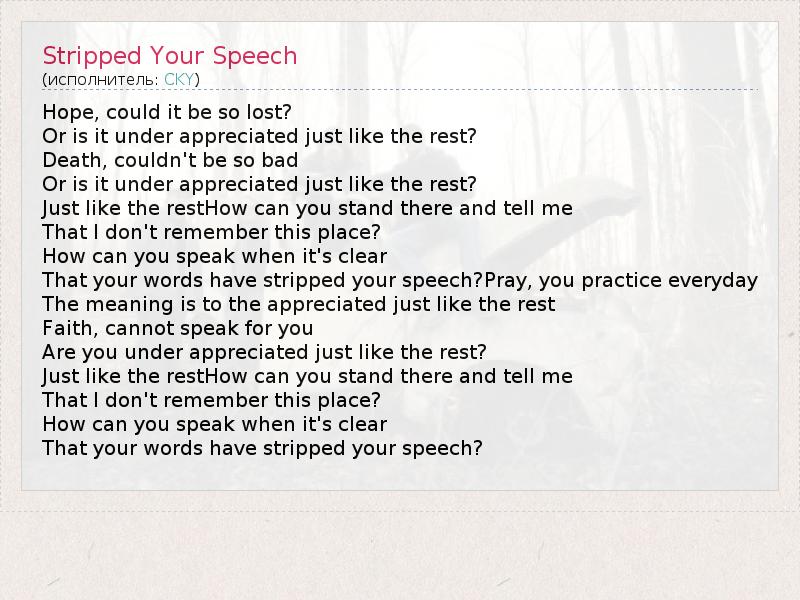 А как ты думаешь, о чем песня "Stripped Your Speech" ?