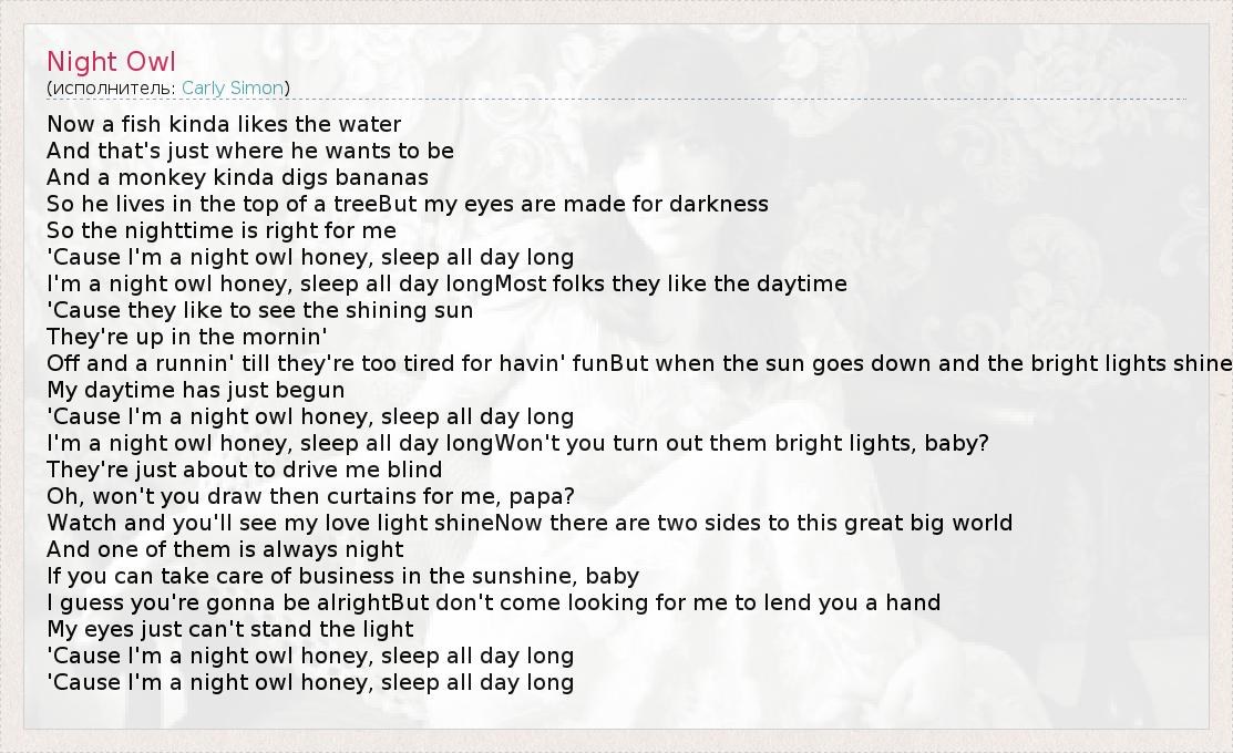 'Cause I'm a night owl honey, sleep all day long