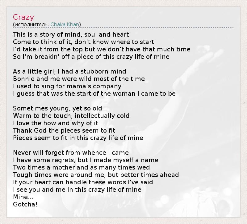 This is a story of mind, soul and heart Come to think of it, don't know where to start I'd take it from the top but we don't have that much time So I'm breakin' off a piece of this crazy life of mine As a little girl, I had a stubborn mind Bonnie and me were wild most of the time I used to sing for mama's company I guess that was the start of the woman I came to be Sometimes young, yet so old Warm to the touch, intellectually cold I love the how and why of it Thank God the pieces seem to fit Pieces seem to fit in this crazy life of mine Never will forget from whence I came I have some regrets, but I made myself a name Two times a mother and as many times wed Tough times were around me, but better times ahead If your heart can handle these words I've said I see you and me in this crazy life of mine Mine... Gotcha!