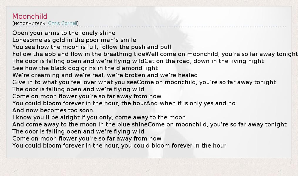 Give in to what you feel over what you seeCome on moonchild, you're so far away tonight