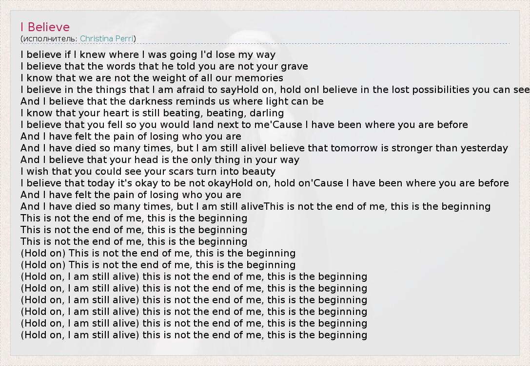 I believe if I knew where I was going I'd lose my way I believe that the words that he told you are not your grave I know that we are not the weight of all our memories I believe in the things that I am afraid to sayHold on, hold onI believe in the lost possibilities you can see And I believe that the darkness reminds us where light can be I know that your heart is still beating, beating, darling I believe that you fell so you would land next to me'Cause I have been where you are before And I have felt the pain of losing who you are And I have died so many times, but I am still aliveI believe that tomorrow is stronger than yesterday And I believe that your head is the only thing in your way I wish that you could see your scars turn into beauty I believe that today it's okay to be not okayHold on, hold on'Cause I have been where you are before And I have felt the pain of losing who you are And I have died so many times, but I am still aliveThis is not the end of me, this is the beginning This is not the end of me, this is the beginning This is not the end of me, this is the beginning This is not the end of me, this is the beginning (Hold on) This is not the end of me, this is the beginning (Hold on) This is not the end of me, this is the beginning (Hold on, I am still alive) this is not the end of me, this is the beginning (Hold on, I am still alive) this is not the end of me, this is the beginning (Hold on, I am still alive) this is not the end of me, this is the beginning (Hold on, I am still alive) this is not the end of me, this is the beginning (Hold on, I am still alive) this is not the end of me, this is the beginning (Hold on, I am still alive) this is not the end of me, this is the beginning