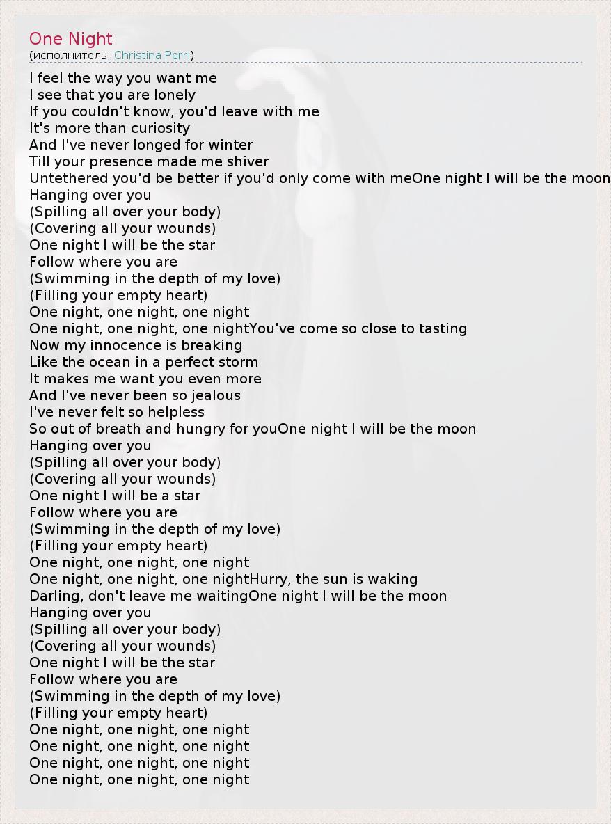 I feel the way you want me I see that you are lonely If you couldn't know, you'd leave with me It's more than curiosity And I've never longed for winter Till your presence made me shiver Untethered you'd be better if you'd only come with meOne night I will be the moon Hanging over you (Spilling all over your body) (Covering all your wounds) One night I will be the star Follow where you are (Swimming in the depth of my love) (Filling your empty heart) One night, one night, one night One night, one night, one nightYou've come so close to tasting Now my innocence is breaking Like the ocean in a perfect storm It makes me want you even more And I've never been so jealous I've never felt so helpless So out of breath and hungry for youOne night I will be the moon Hanging over you (Spilling all over your body) (Covering all your wounds) One night I will be a star Follow where you are (Swimming in the depth of my love) (Filling your empty heart) One night, one night, one night One night, one night, one nightHurry, the sun is waking Darling, don't leave me waitingOne night I will be the moon Hanging over you (Spilling all over your body) (Covering all your wounds) One night I will be the star Follow where you are (Swimming in the depth of my love) (Filling your empty heart) One night, one night, one night One night, one night, one night One night, one night, one night One night, one night, one night