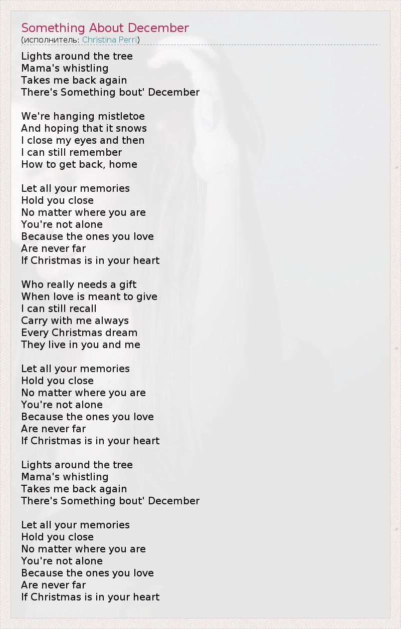Lights around the tree Mama's whistling Takes me back again There's Something bout' December We're hanging mistletoe And hoping that it snows I close my eyes and then I can still remember How to get back, home Let all your memories Hold you close No matter where you are You're not alone Because the ones you love Are never far If Christmas is in your heart Who really needs a gift When love is meant to give I can still recall Carry with me always Every Christmas dream They live in you and me Let all your memories Hold you close No matter where you are You're not alone Because the ones you love Are never far If Christmas is in your heart Lights around the tree Mama's whistling Takes me back again There's Something bout' December Let all your memories Hold you close No matter where you are You're not alone Because the ones you love Are never far If Christmas is in your heart