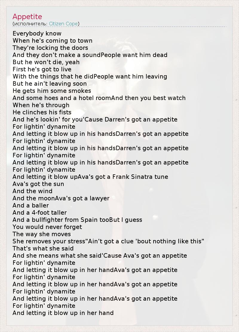 Everybody know When he's coming to town They're locking the doors And they don't make a soundPeople want him dead But he won't die, yeah First he's got to live With the things that he didPeople want him leaving But he ain't leaving soon He gets him some smokes And some hoes and a hotel roomAnd then you best watch When he's through He clinches his fists And he's lookin' for you'Cause Darren's got an appetite For lightin' dynamite And letting it blow up in his handsDarren's got an appetite For lightin' dynamite And letting it blow up in his handsDarren's got an appetite For lightin' dynamite And letting it blow up in his handsDarren's got an appetite For lightin' dynamite And letting it blow upAva's got a Frank Sinatra tune Ava's got the sun And the wind And the moonAva's got a lawyer And a baller And a 4-foot taller And a bullfighter from Spain tooBut I guess You would never forget The way she moves She removes your stress"Ain't got a clue 'bout nothing like this" That's what she said And she means what she said'Cause Ava's got an appetite For lightin' dynamite And letting it blow up in her handAva's got an appetite For lightin' dynamite And letting it blow up in her handAva's got an appetite For lightin' dynamite And letting it blow up in her handAva's got an appetite For lightin' dynamite And letting it blow up in her hand